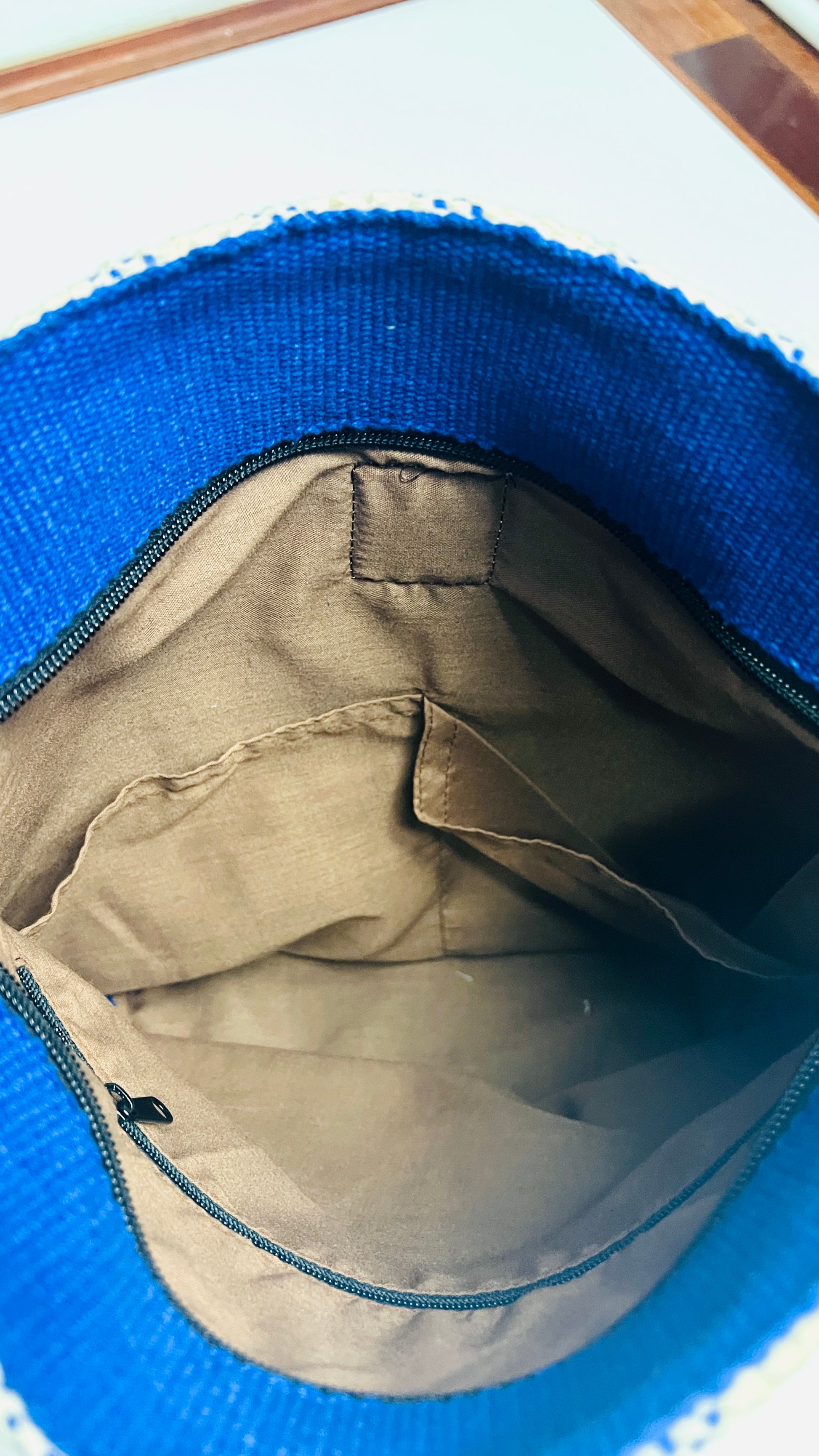 Blue and white shoulder bag with woven checkered pattern on the upper half and solid blue cotton fabric on the lower half. It has an adjustable fabric strap . It has decent size zipper pocket for all small item storage like phone, wallet or keys. Addition couple of open small pocket inside .Out side 2 open pockets. It has a casual, handmade look, ideal for everyday use.