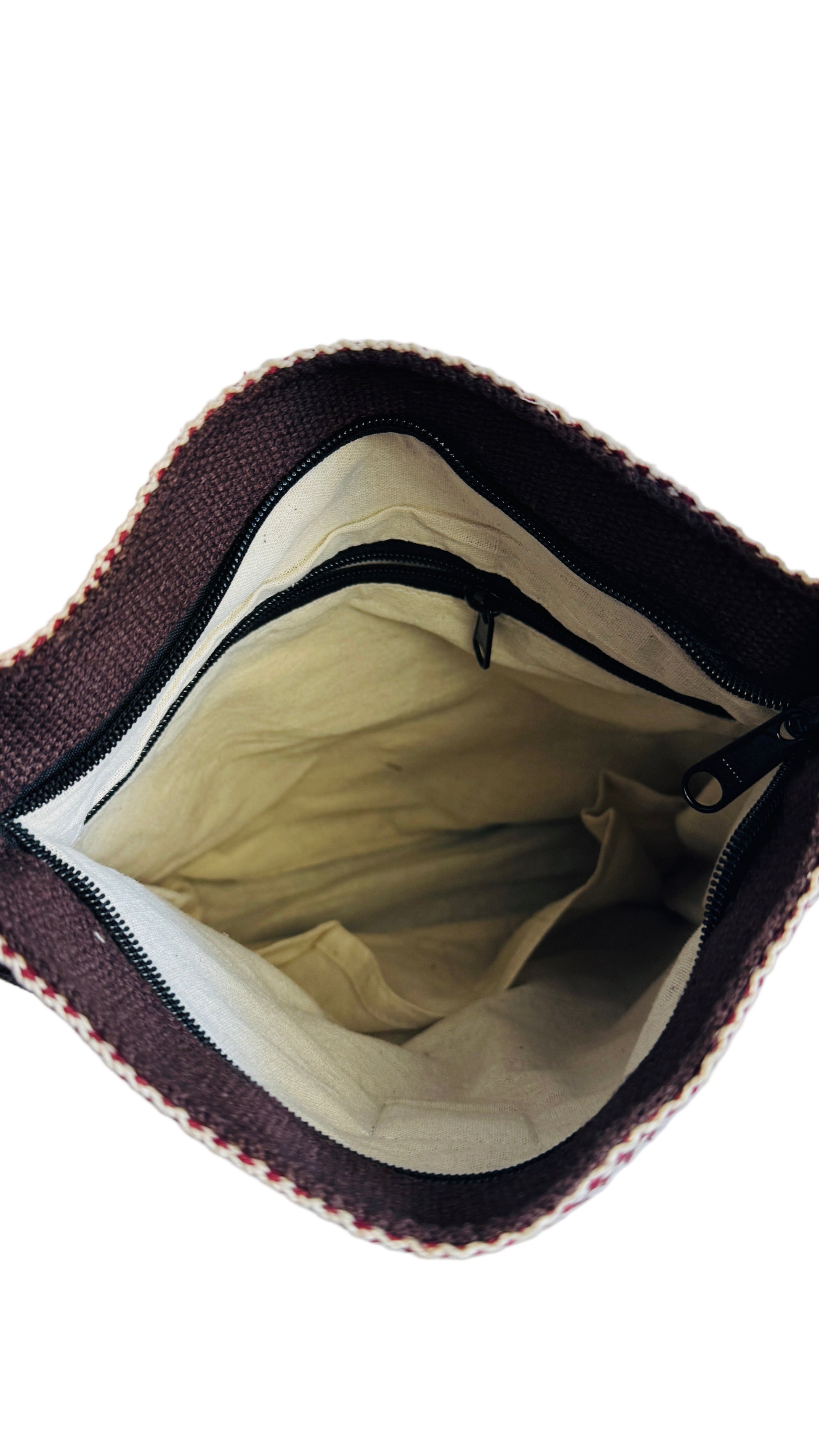Handmade- Style shoulder bag with a bohemian touch with multicolours mix and matches. The lower section has given different colour match, providing a balanced contrast. It has a wide, adjustable shoulder strap made from matching colours material, allowing for comfortable crossbody or shoulder wear. Lightweight. suitable for everybody use or relaxed outings. It has one zipper pocket inside and 2 open pockets outside.
