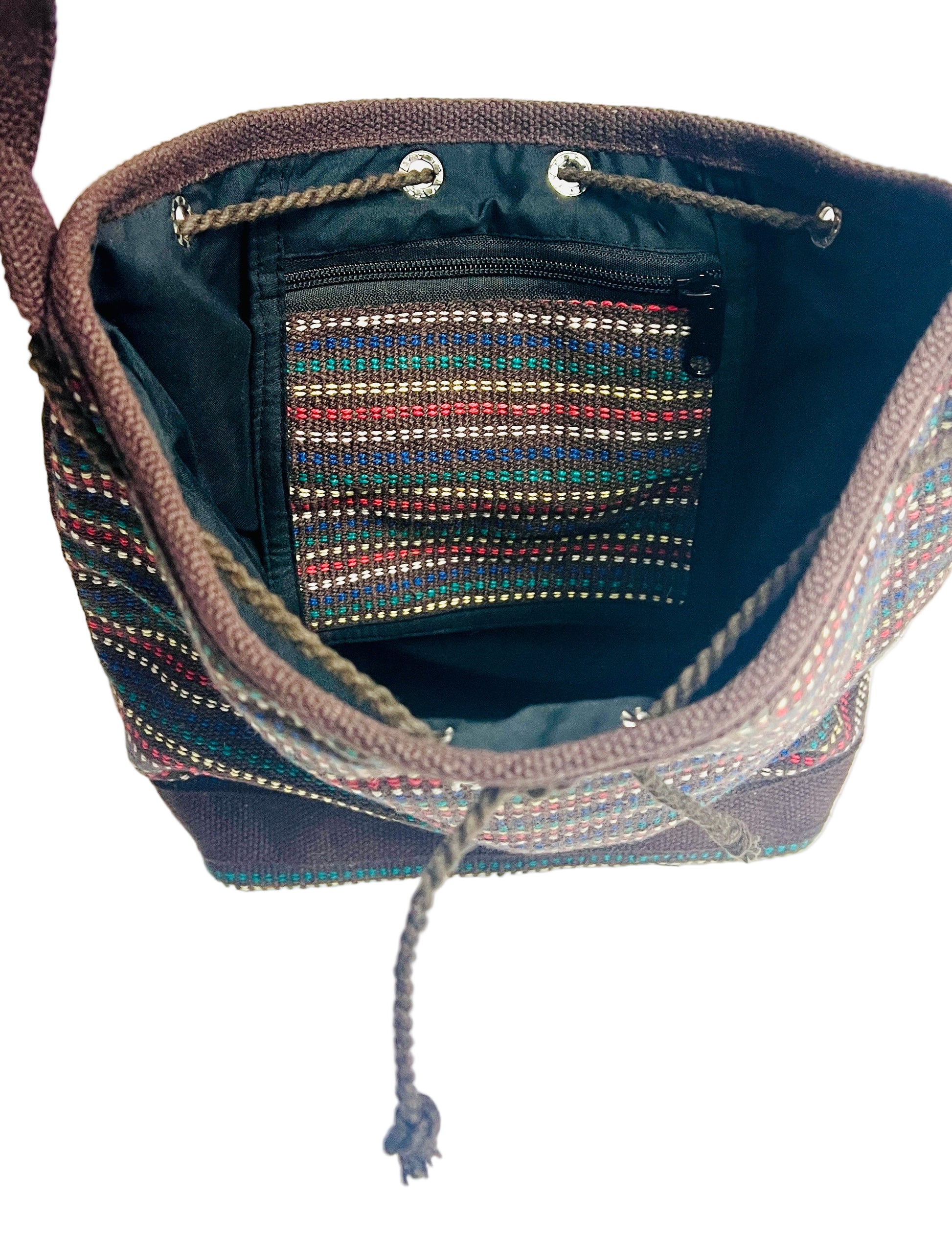 This is a casual, bohemian -Style shoulder bag with an adjustable strap. Bag features vertical bucket -like shape with flat base. Made with cotton thread fabric comes in multicolours. Opening has a drawstring closure thread. Relaxed look and artisan-inspired, suitable for everyday use or casual outings. 5